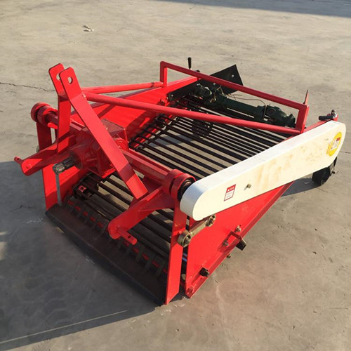 山東曹縣魯富機(jī)械紅薯收獲機(jī)與小四輪拖拉機(jī)傳動(dòng)軸連接,經(jīng)主傳動(dòng)軸上偏心塊、連桿帶動(dòng)挖掘鏟作前后往復(fù)運(yùn)動(dòng),再由傳動(dòng)軸左端齒輪帶動(dòng)過(guò)橋軸上變速齒輪,并改變傳動(dòng)方向,再經(jīng)鏈條帶動(dòng)分離排鏈主傳動(dòng)軸,并由主傳動(dòng)軸兩端偏心塊帶動(dòng)振動(dòng)篩上下抖動(dòng)。在拖拉機(jī)的牽引下,使挖掘鏟挖掘出來(lái)的馬鈴薯(大蒜、地瓜等)鋪放在分離排鏈上,在分離排鏈的轉(zhuǎn)動(dòng)下土落在分離排鏈下方,馬鈴薯(大蒜、地瓜等)和未落下的土塊,在分離排鏈上面落在振動(dòng)篩上,再次清選分離后集中鋪放在機(jī)后地面上。